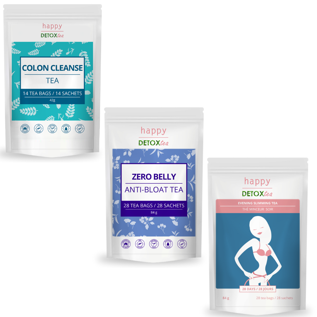 Das Happy Detox Tea Abnehm-Paket enthält: Original Abnehmtee - Zero Belly Tee - Zimt Abnehmtee - Colon Cleanse Tee