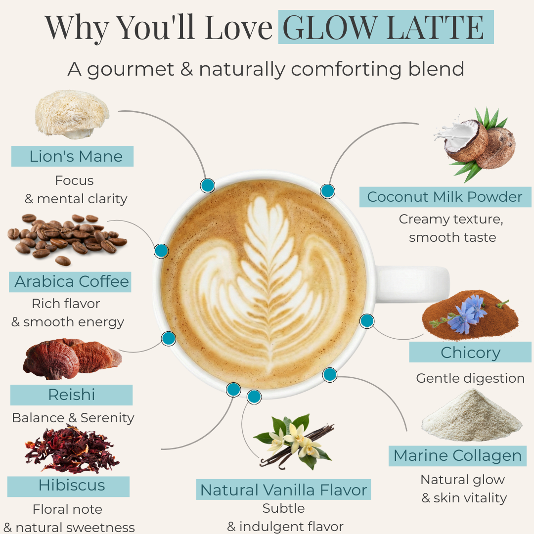 Dank der einzigartigen Kombination aus adaptogenen Pilzen, meereskollagen und natürlichen Inhaltsstoffen begleitet Glow Latte by AdapCoffee Ihren Alltag sanft und genussvoll: