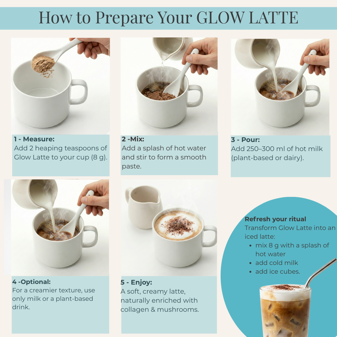 Geben Sie 2 gehäufte Teelöffel (8 g) Glow Latte in Ihre Tasse. Gießen Sie etwas heißes Wasser auf und rühren Sie um, dann füllen Sie mit 250 bis 300 ml heißer Milch (pflanzlich oder klassisch) auf. Für eine noch cremigere Textur können Sie ausschließlich Milch verwenden. Glow Latte schmeckt auch hervorragend als Eiskaffee: Mischen Sie 8 g Pulver mit etwas heißem Wasser, fügen Sie kalte Milch und einige Eiswürfel hinzu. Genießen Sie einen milden, cremigen Latte, natürlich angereichert mit Meereskollagen und adaptogenen Pilzen.